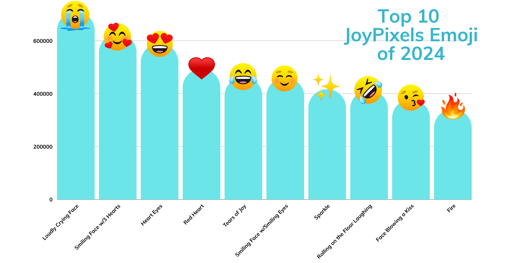 So which emoji stole the spotlight in 2024? According to our data, more than 42 million emoji were sent via EmojiCopy—and the results are in! The reigning champ this year was the Loudly Crying Face 😭, capturing hearts (and dramatic moments) everywhere. Coming in close behind were the Smiling Face with 3 Hearts 🥰, the ever-adorable Heart Eyes 😍, and the timeless Red Heart ❤️.